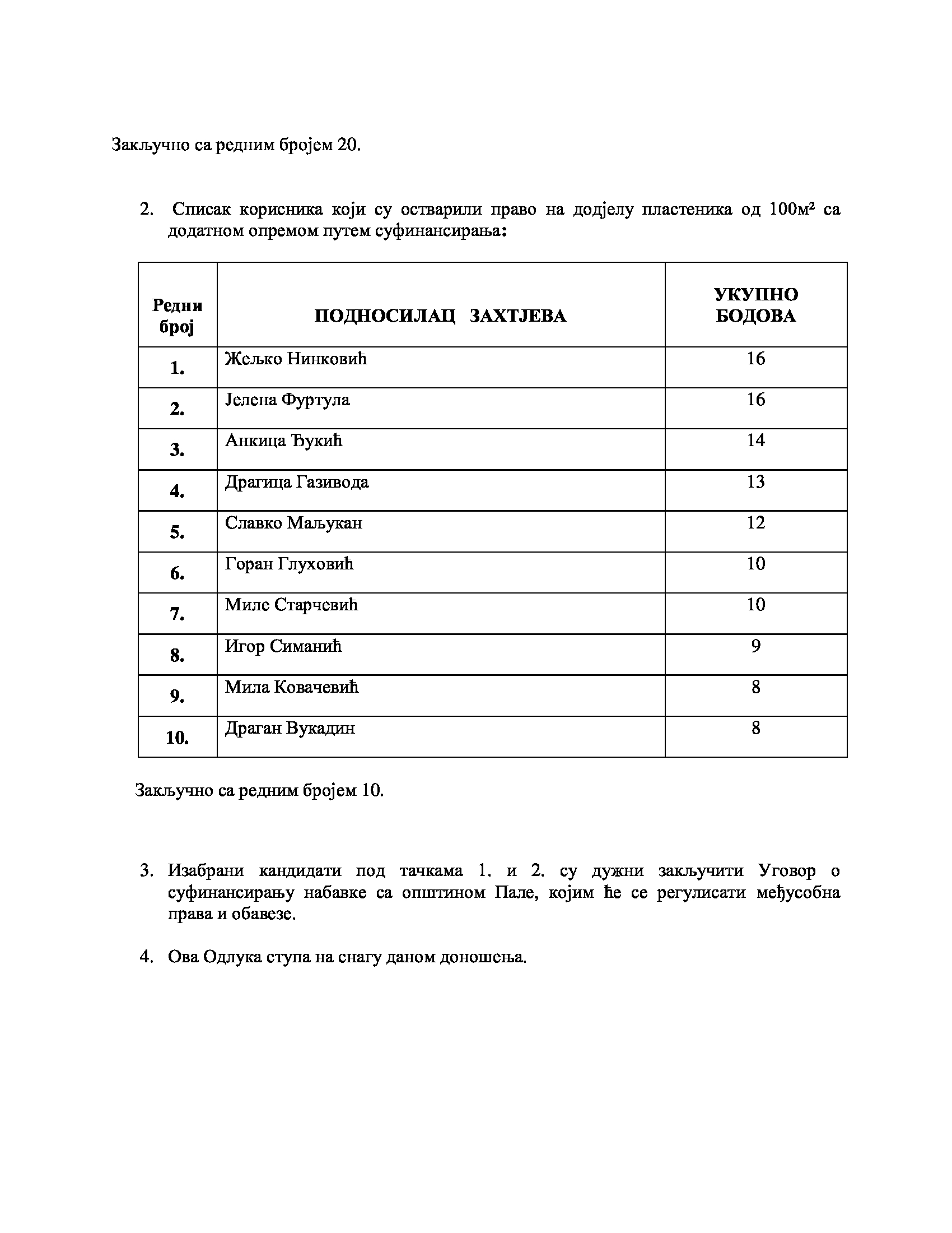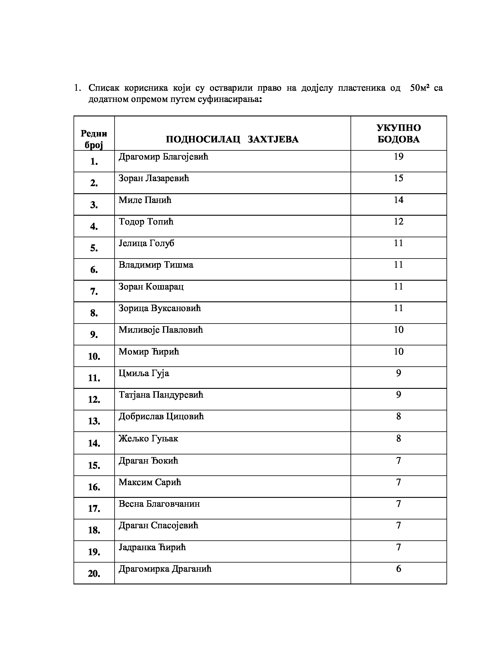 о избору кандидата за додјелу пластеника по основу Јавног позива за додјелу пластаника од 50м² и 100м² са додатном опремом путем суфинансирања